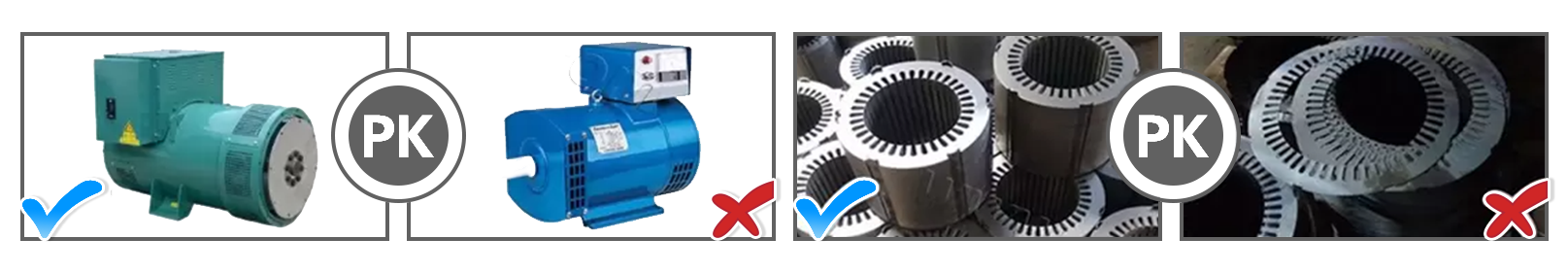 Alternador sem escovas com fio 100% de cobre OU alternador STAMFORD original. | Alternador com escovas de baixa qualidade. | Utilize chapas de aço silício laminadas a frio de alta qualidade. | Utilizar chapa de aço silício laminada a quente de baixa qualidade. |
